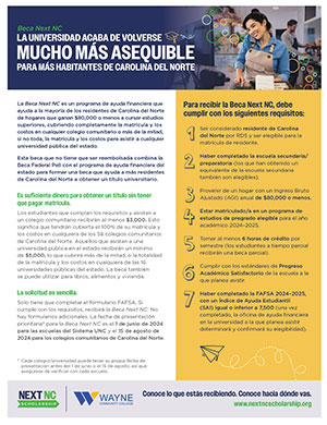 Applying is simple. Just submit the FAFSA form. If you’re eligible, you’ll receive the Next NC Scholarship. There are no additional forms to fill out. WCC’s School Code is 008216.