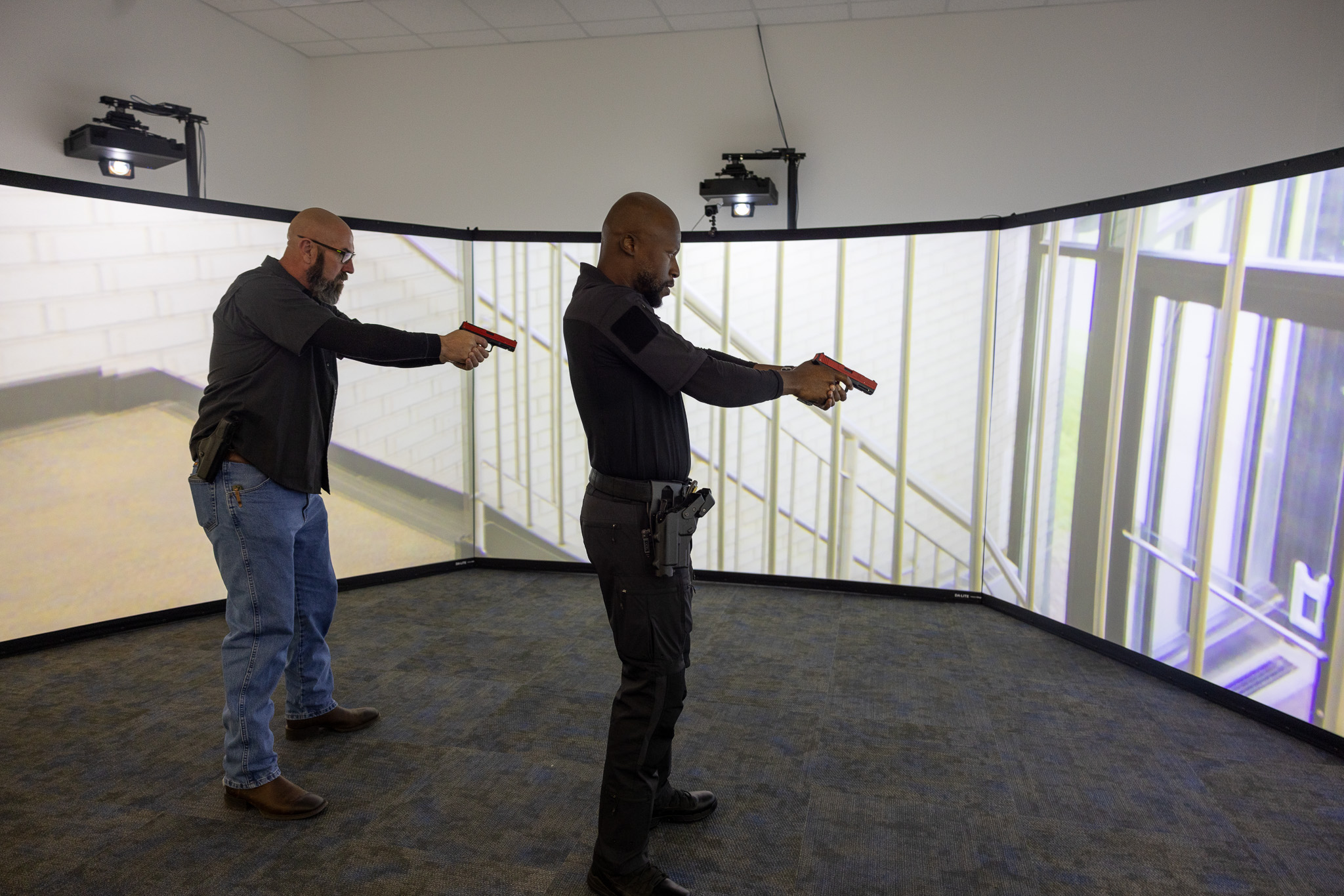 The MILO Range Theater 300 is a use-of-force simulator that provides a fully immersive and realistic training environment. With five screens and projectors, surround sound, and trainee weapon sets, the lab presents students with scenarios to practice responding to multiple threats, learning the proper tactics to apply.