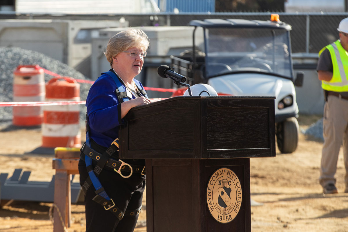 Wayne Community College’s new Center for Industrial Technology and Engineering (CITE) was “topped out” with its final steel beam on Thursday, Nov. 16. WCC President Patty Pfeiffer helped Steel Tech workers place the beam in the building.