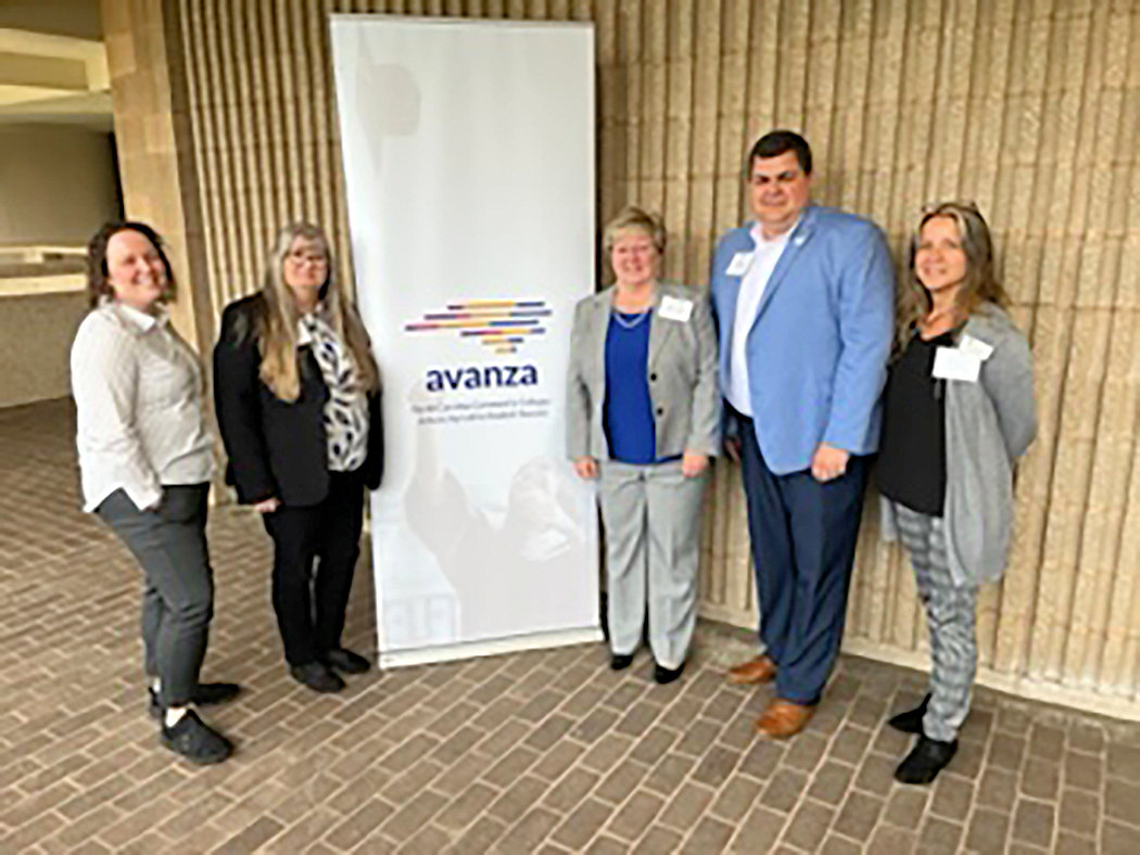 Five people stand around an Avanza sign