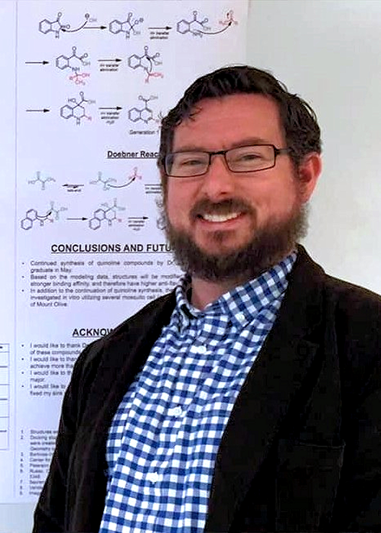 A man stands in front of chemistry equations.