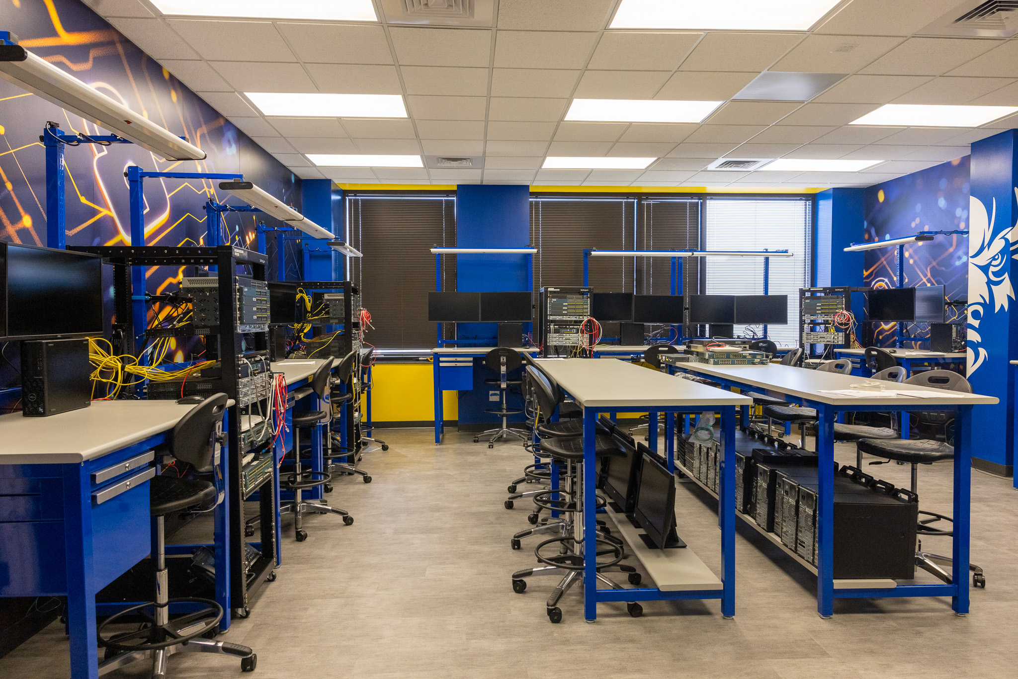 The lab features new networking equipment, a mobile instructor workstation, smart boards, video conferencing tools for more interactive teaching and collaboration, and ergonomic seating for a professional-grade environment. It has two sections—one for lectures and one for activities.