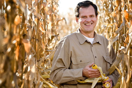 A man stands in a corn field, smiling; he holds an ear of corn.